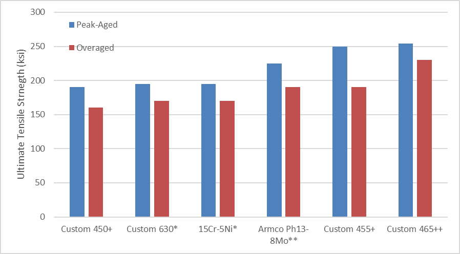 Typical room temperature mechanical properties for Custom 465 stainless can be seen in Table 2. Custom 465 stainless is capable of about 260 ksi (1795 MPa) ultimate tensile strength if peak aged (H900 condition). In this condition, it still retains high notch tensile strength and fracture toughness.