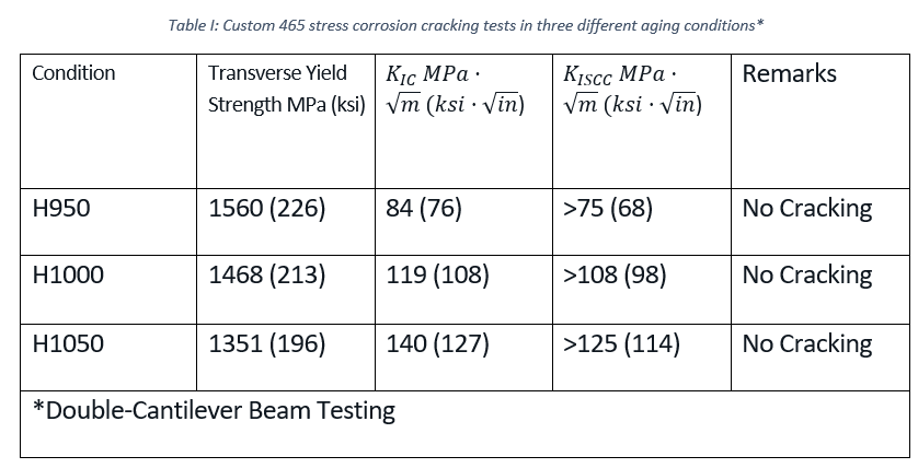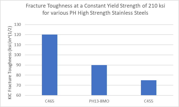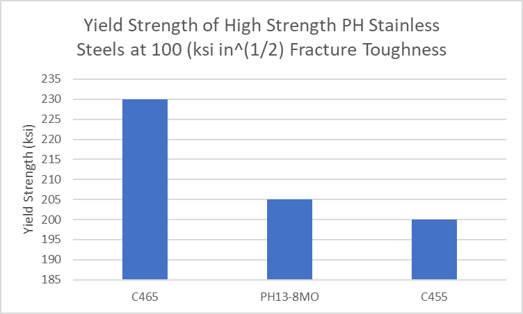 The resistance of Custom 465 alloy to SCC is considered (a) comparable to that of 13Cr-8Ni and Custom 455 stainless, but at significantly higher strength, and (b) superior to that of both of them at the same strength. For example, if one compares the yield strength for each of these three alloys if heat treated to a longitudinal fracture toughness of 100 ksi sqrt(in) (110 MPa sqrt(in)), they can be ranked as follows: