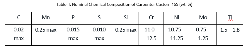 Nominal chemical composition of Custom 465 stainless is shown in Table II: