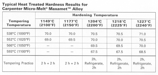 Carpenter Technology Micro-Melt Maxamet alloy has a room temperature hardness capability of up to HRC 71.0 when using typical high speed steel heat treating practice and equipment. All samples tested for heat treated hardness in Fig. 3 were preheated at 843°C (1550°F), equalized, austenitized for 3 minutes at the indicated temperature and tempered at the temperatures shown.